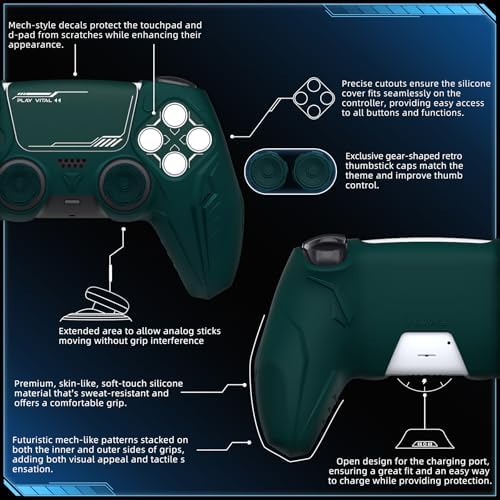 PlayVital Silicone Skin Set for PS5 Controller – Charging Dock Compatible, Full Protection Case with Futuristic CyberMech Design, Soft Cover with Thumb Grips & Stickers – Racing Green